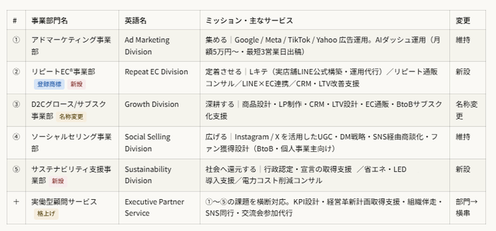 スパイアソリューション株式会社、事業ポートフォリオを「顧客ジャーニー軸」で全面再編。登録商標「リピートEC®」事業部・サステナビリティ支援事業部を新設し、5専門部門体制へ移行。InsideFullness™事業を終了、実働型顧問は全部門横断型サービスへ格上げ。
