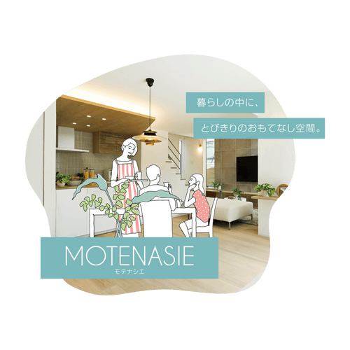 今出川住宅展示場の新モデルハウスMOTENASIE [ モテナシエ ] は、「家」が持つ、家族や友人を迎えるあたたかな想いと、「おもてなし」が醸し出す、特別なひとときを彩るという上質感。その二つを重ね合わせ、“もてなす家”という新しい価値観を表現しています。