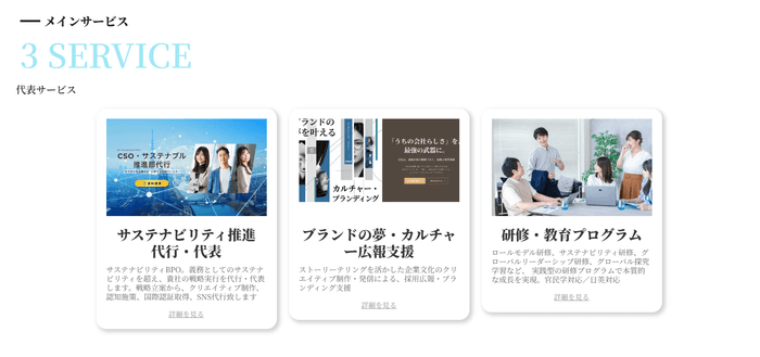 弊社の3つの代表的なサービスを一目で理解いただけるよう、トップページに配置しました。
