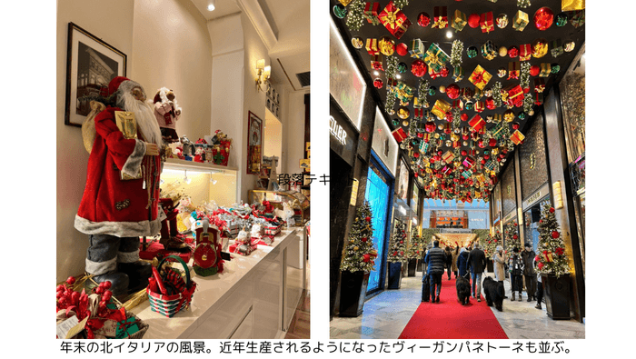 2023年のクリスマスシーズンでは、伝統的なお菓子に混ざり、ヴィーガンパネトーネも並ぶ姿が見られます。これも数年前までは見たことのなかった新しい年末の風景です。