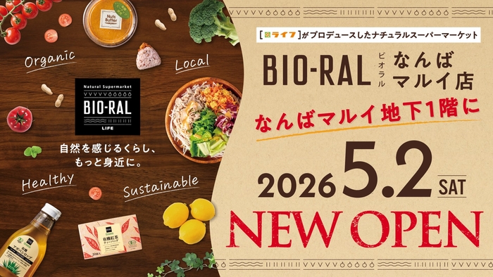 “おいしい” “ワクワク” “ハッピー” をお届けする株式会社ライフコーポレーションは、2026年5月2日(土)、大阪メトロ御堂筋線「なんば」駅直結の商業施設「なんばマルイ」地下1階に、ナチュラルスーパーマーケット「ビオラルなんばマルイ店」をオープンいたします。